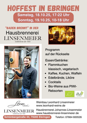 Die Hausbrennerei Linsenmeier veranstaltet zusammen mit LEONhard Weine ein Hoffest im Rahmen von "Baden brennt" in der Schönbergstraße 44 in Ebringen. Baden öffnet seine Brennereien und wir sind wieder dabei.