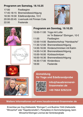 Kommen Sie am Sonntag, 19.10.25 zwischen 11 und 18 Uhr vorbei, um die Brennerei zu besichtigen. Starten Sie um 10 Uhr in den Tag mit Yoga. Ihre Kinder können sich beim Kinderschminken, Kürbisschnitzen und Basteln die Zeit vertreiben.